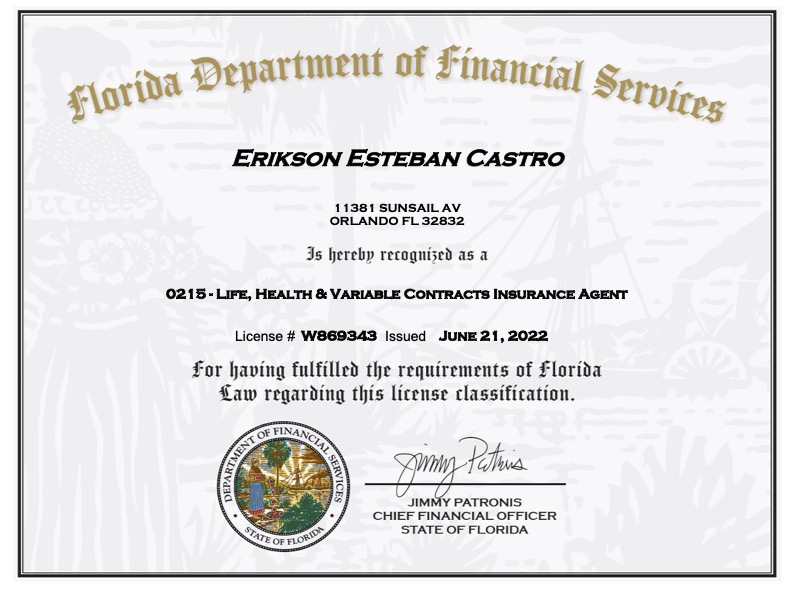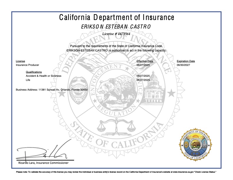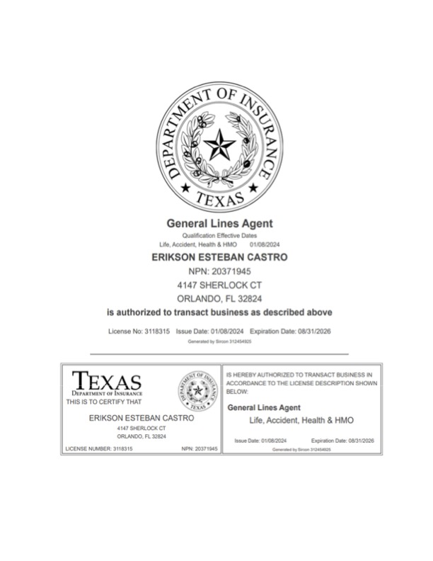 Soy un agente de seguros licenciado en más de 10 estados de los Estados Unidos, cumpliendo con todos los requisitos y regulaciones tanto a nivel estatal como federal.